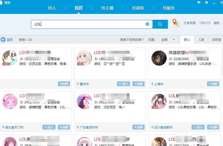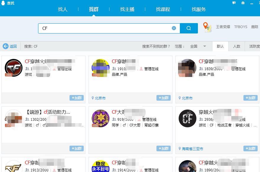 尝试搜索了一下CF、LOL等词条,发现是能搜索到相关群的。