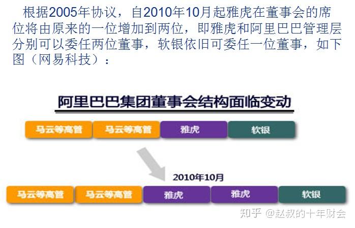 雅虎此前持有阿里巴巴35%投票权。从2010年10月开始,持股阿里巴巴集团39.0%经济权益的雅虎,其投票权将从35%增加至39.0%,而马云等管理层的投票权将从35.7%降为31.7%,软银保持29.3%的经济权益及投票权不变,届时雅虎将成为阿里巴巴真正的第一大股东。