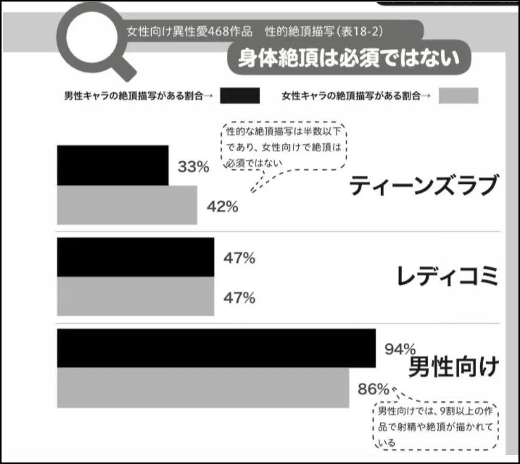 比如男性向作品中,有90%左右的故事会有社保或者绝顶之类的描写。与之相对的,女性向作品中描写比例却只有37%~47%。女性对啪啪的高潮场景可能不像男性那样特别在意。