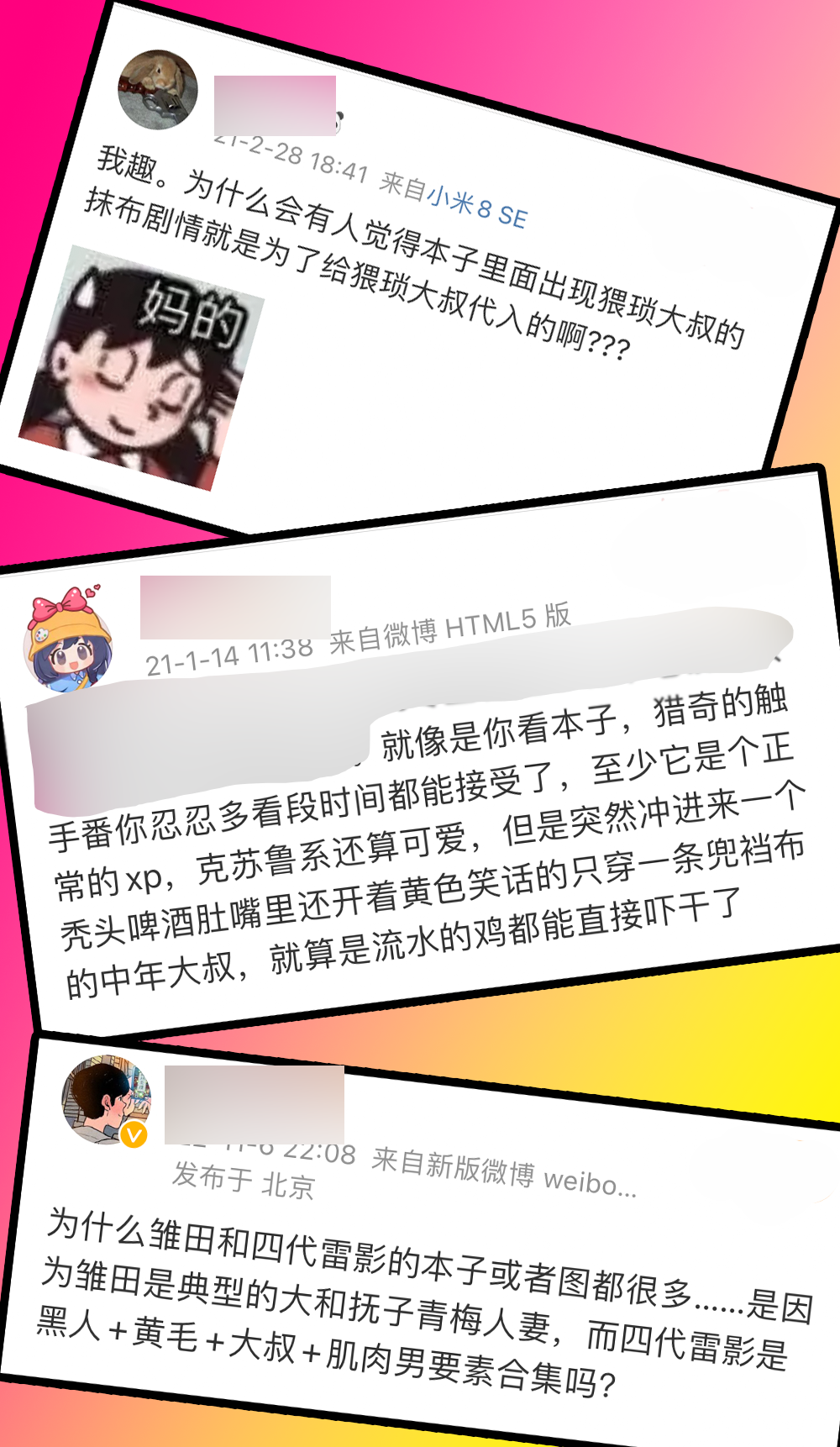 一个举证是,几个月前毛玉老师的CM新刊疑似出现大叔与NTR元素,因此被中国网友炎上,当时节奏闹得沸沸扬扬的。与之相对的,我们似乎很少有听闻BL作品因为出现相貌丑陋的女性并不算雷区。