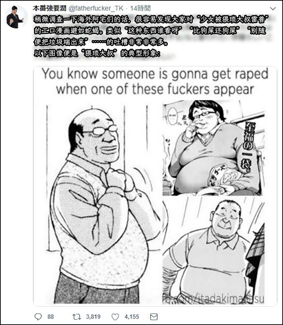 比如下面有个小哥稍微调查了一下,发现欧美的阿宅们对于“少女遭到猥琐大叔雷普(raped)”的情节非常反感,避如蛇蝎。