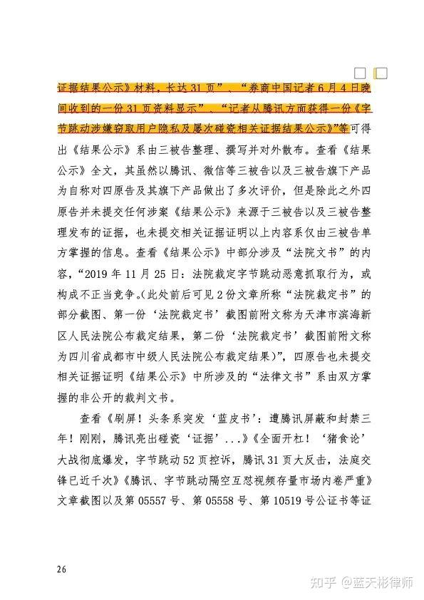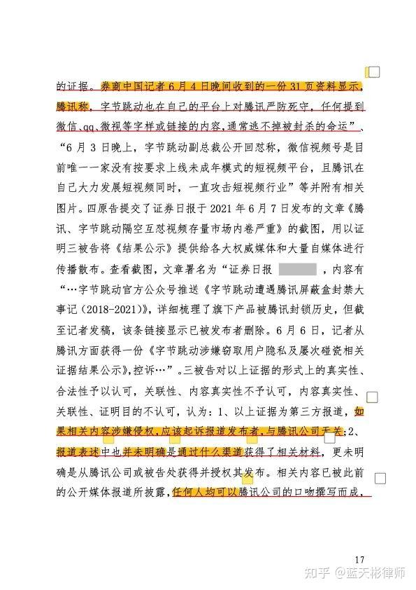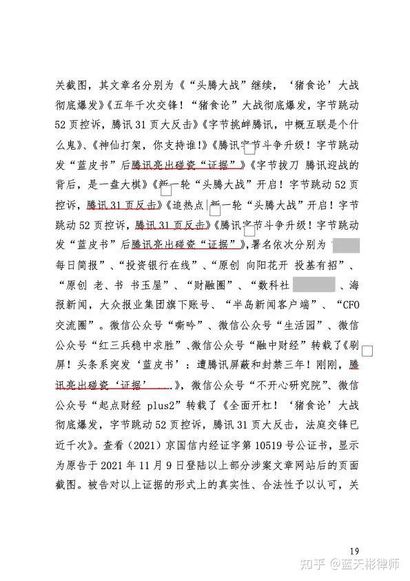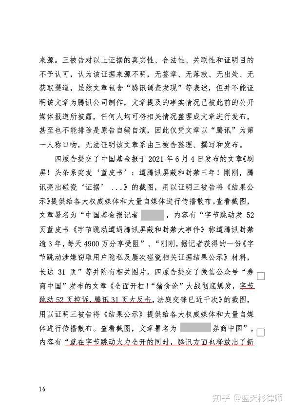 “记者从腾讯获得31页的《字节跳动涉嫌窃取用户隐私及屡次碰瓷相关证据结果公示》。”《券商中国》发布报道《全面开杠!"猪食论"大战彻底爆发,字节跳动52页控诉,腾讯31页大反击,法庭交锋已近千次》,称“就在字节跳动火力全开的同时,腾讯方面也释放出了新的证据。6月4日晚间,券商中国记者最新收到的一份31页资料显示……”