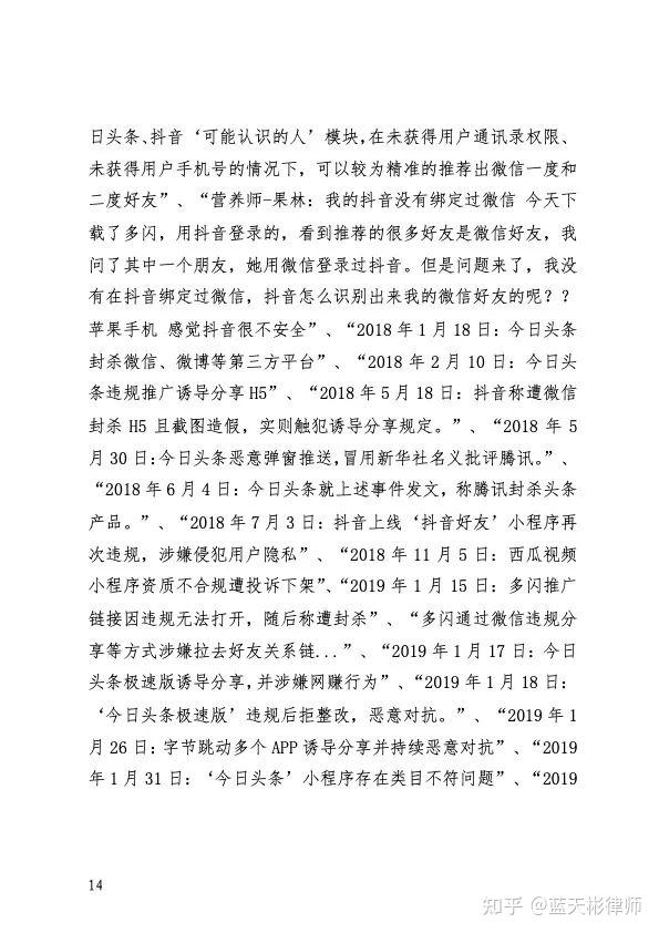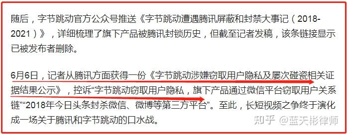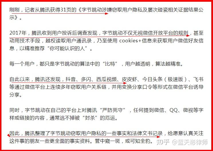 比如文章中称“腾讯调查发现,字节跳动不仅无视微信开放平台规则,甚至动用技术手段,越权读取用户通讯录,乃至使用cookies+信息来获取用户微信好友”,“腾讯还发现,抖音、多闪、西瓜视频、皮皮虾、今日头条(极速版)、飞书等通过微信平台上连续多年窃取用户关系链”。