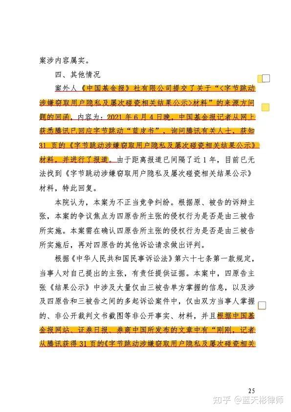 最终,法院方面认为,虽然多家媒体和自媒体在报道中提到“从腾讯处获得《结果公示》”,但原告抖音方面并未提交直接证据证明腾讯向媒体提供了《结果公示》。《中国基金报》的说明中提到“从网上获悉”,并称“询问腾讯有关人士”但也无法证实“腾讯有关人士”的行为是否为腾讯所实施。