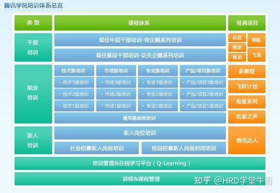 腾讯专门成立腾讯学院,建立了包括新人培训、职业培训、干部培训的培训体系,孵化了一系列经典的培训项目,帮助不同层级、不同岗位的员工针对性地自我提升,实现职业通道的顺利发展。