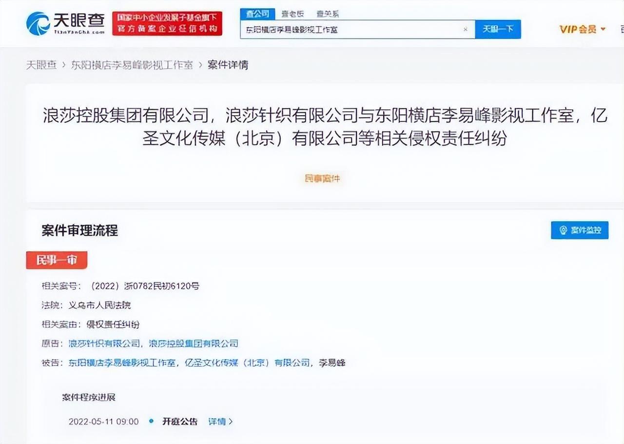天眼查App显示,近日,浪莎与李易峰工作室等相关侵权责任纠纷新增开庭公告,原告为浪莎针织有限公司、浪莎控股集团有限公司,被告为东阳横店李易峰影视工作室、亿圣文化传媒(北京)有限公司、李易峰,开庭日期为5月11日,经办法院为义乌市人民法院。