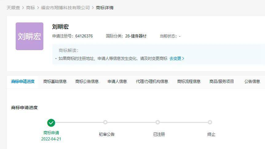刘畊宏因直播燃脂健身操火遍全网,吸引了众多“刘畊宏女孩”跟练。近日,记者发现“刘畊宏”商标被福建和香港两公司申请注册,国际分类包括健身器材、服装鞋帽等,当前商标状态均为申请中。“刘畊宏女孩”也被广西一公司申请注册,国际分类为日化用品。(北青网)