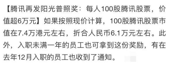 8日,有消息称,腾讯发年终奖了,阳光普照,每名员工奖励100股腾讯股票,解禁期一年。如果按照现价计算,100股腾讯股票市值在7.4万港元左右,折合人民币6.1万元左右。此外,入职未满一年的员工也可拿到这份奖励,有在去年12月入职的员工也收到了通知。不过腾讯方面对记者表示,不是每个人都有,公司在今年年终奖中,对做出特别贡献的员工授予了一笔同心同行奖(100股的一次性激励)。
